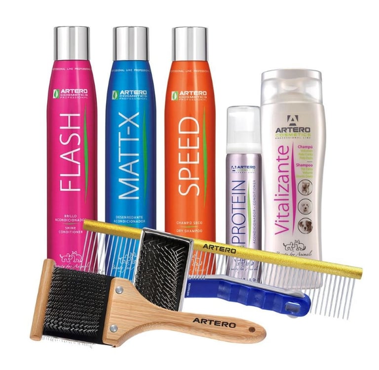 Trabajamos con Artero, una marca europea que garantiza calidad y estándares altos en cosmética profesional para estilismo canino.